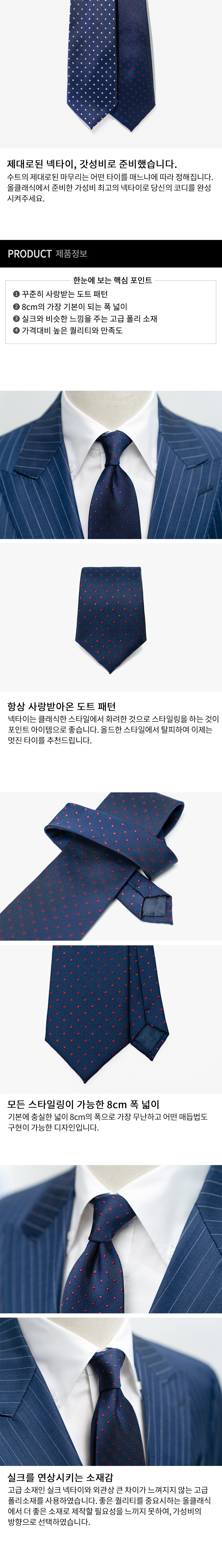 네이비는 신뢰의 상징입니다. 꾸준히 사랑받는 네이비 도트 타이로 신뢰를 UP! 시켜주세요. 실크와 비슷한 느낌의 고급 폴리에스터를 사용하여 가격대비 품질이 좋은 제품입니다.